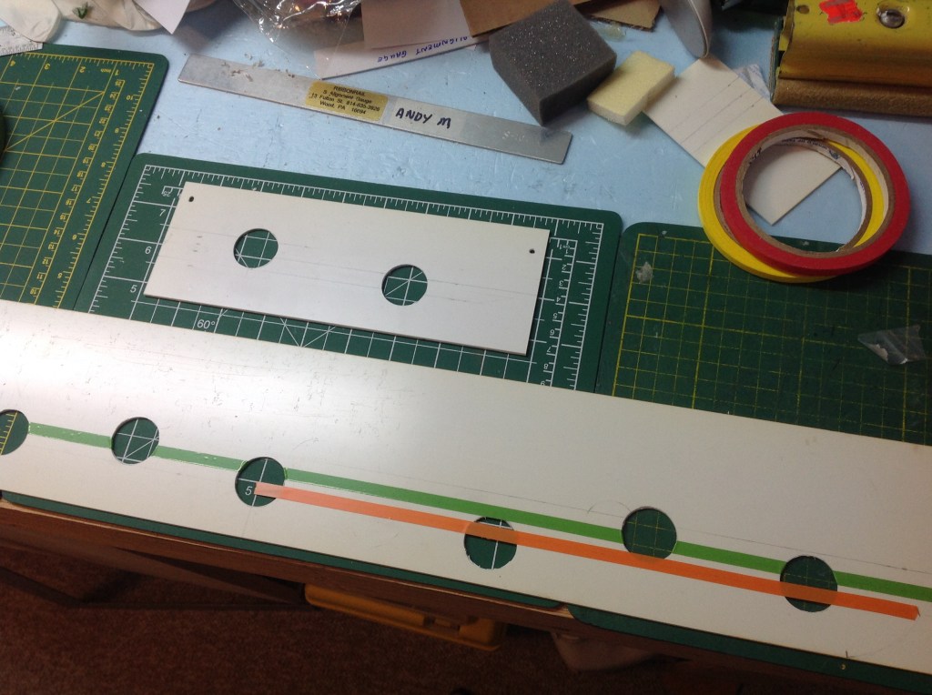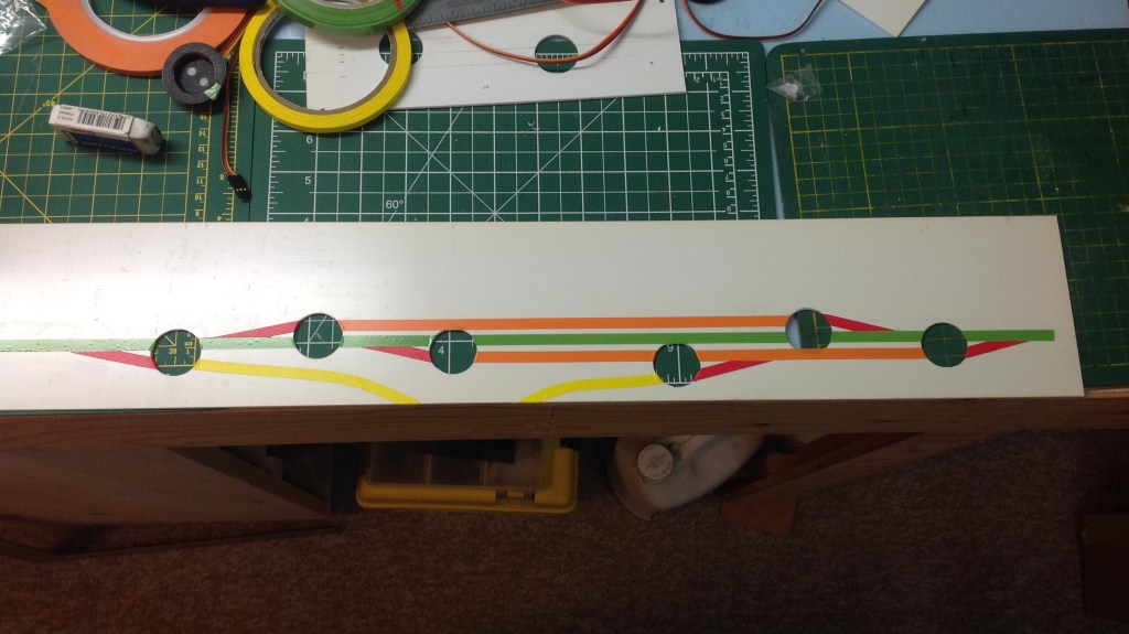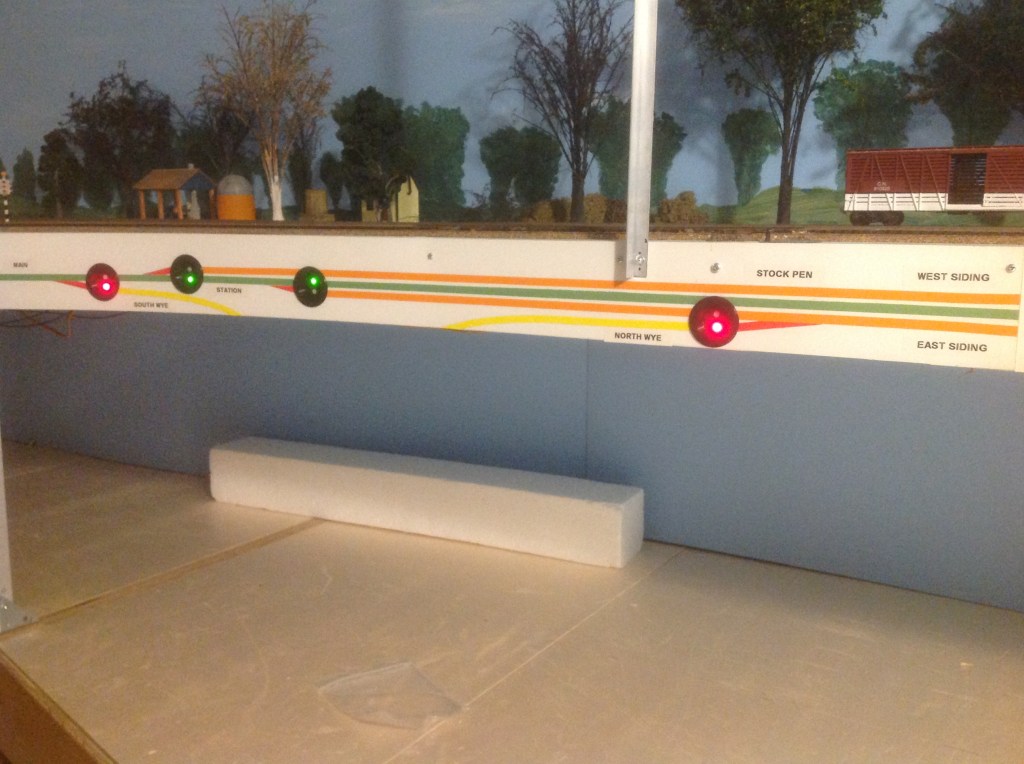 Control panels were made from 0.060” sheet plastic cut into 3.5” strips. These strips were donated by my friend, Ken Wilson. I made up a pattern to design where the mini cup toggles were to go depending on mainline or siding use. I used green tape for mainline, red tape for the divergence or the turnout and orange tape for sidings. Yellow tape was used for the legs of the wye. I labelled the tracks wherever I could. I used my wife’s label maker.